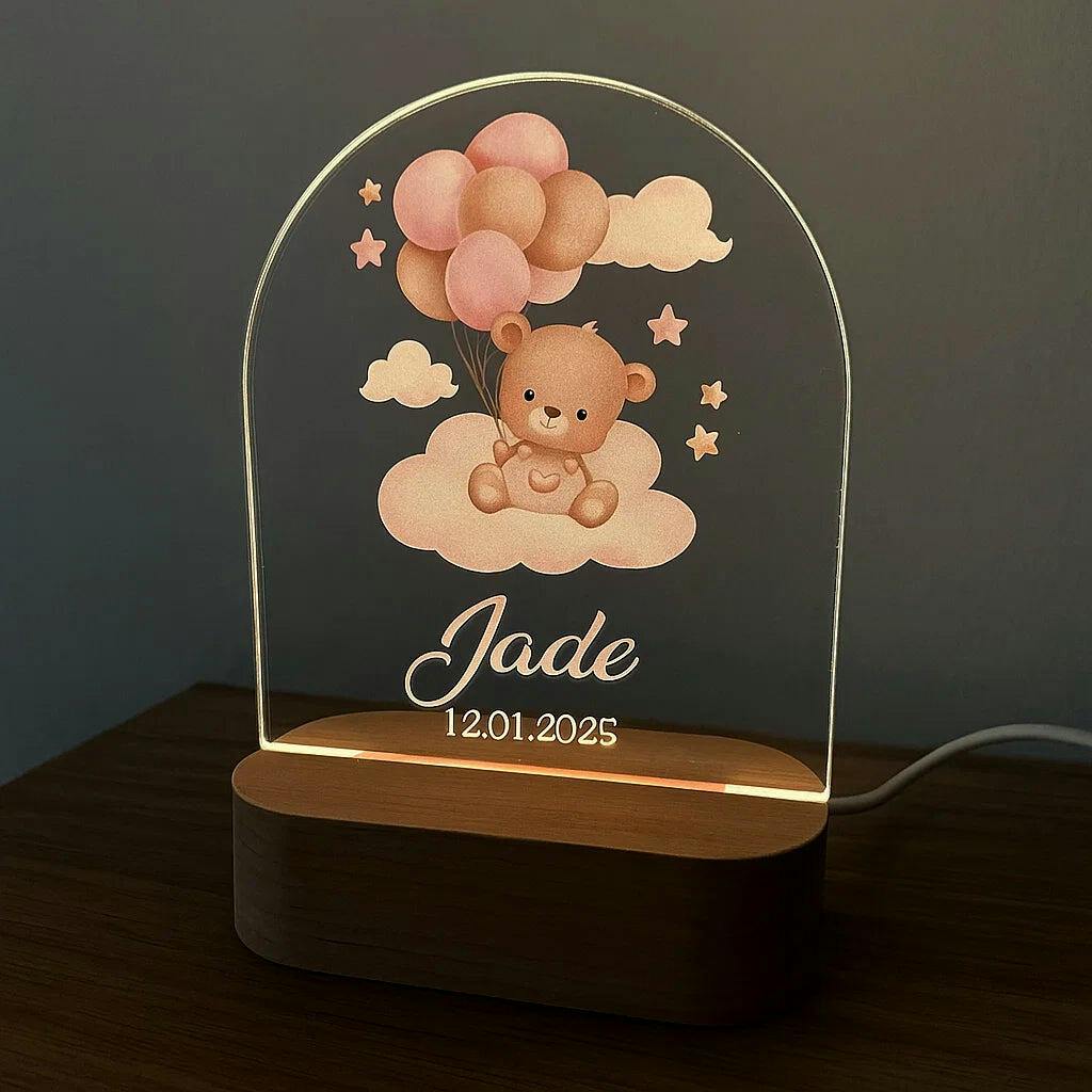 Verleihen Sie dem Zimmer Ihres Babys mit diesem personalisierten Nachtlicht einen Hauch von Magie. Dieses Nachtlicht für Mädchen ist mit einem niedlichen Teddybär illustriert, der auf einer Wolke mit rosa Luftballons schwebt, und wird mit dem Vornamen und dem Geburtsdatum Ihres Kindes personalisiert. Ein sanftes Licht, das die Nächte Ihres Babys beruhigt.