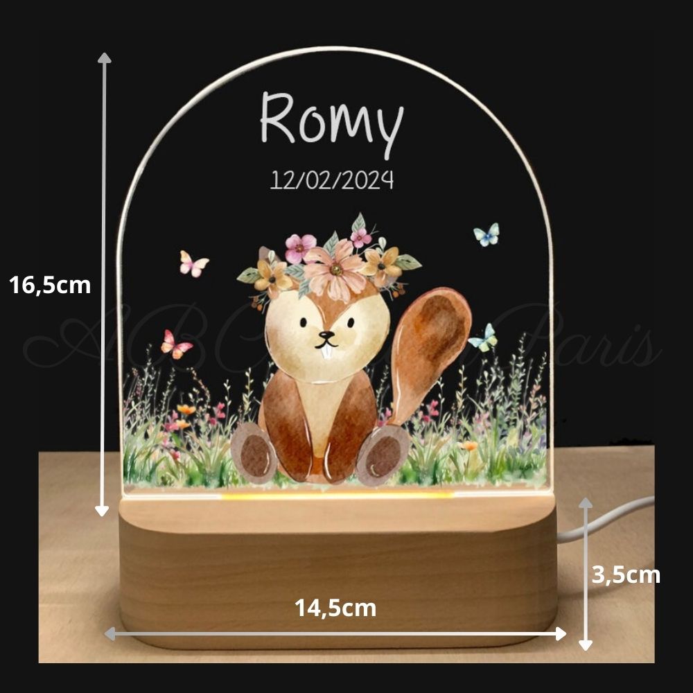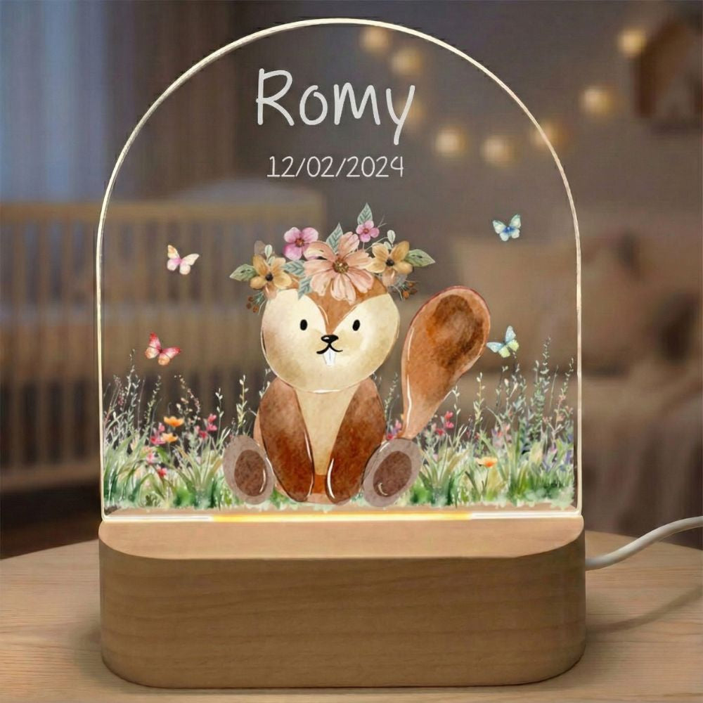 Dieses Nachtlicht ist mit dem Vornamen und dem Geburtsdatum personalisiert und wird von einem Biber und einem niedlichen Schmetterling begleitet!