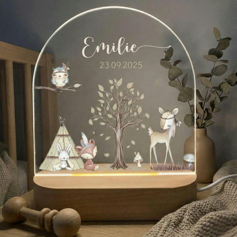 Schaffen Sie mit diesem Nachtlicht, das Waldtiere darstellt, eine magische Atmosphäre im Zimmer Ihres Kindes. Dieses Nachtlicht ist ideal, um Ihr Kind nachts zu beruhigen und zu besänftigen. Es kann mit dem Vornamen und dem Geburtsdatum personalisiert werden.